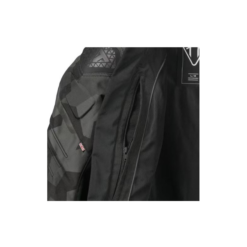 Doublure membrane respirante et imperméable TriTech Doublure en maille pour faciliter la circulation de l’air et améliorer la ventilation. Protège-poignets sur les manches. Ventilations pour diriger le flux d’air au niveau du corps Empiècements extensibles TriStretch aux emplacements stratégiques pour plus de confort pendant la conduite Réglage de l’ourlet Réglage des poignets Tissu extérieur performant TriTech Inserts en tissu extensible TriStretch Protections D3O® amovibles, épaules et coudes (incluses) Protection dorsale D3O® BP4 amovible (incluse) Protection thoracique D3O® en option (vendue séparément) Renforts galvanisés en TPU aux épaules. Renforts galvanisés en polyuréthanes thermoplastiques (TPU) aux épaules et aux genoux Inserts réfléchissants sombres sur les manches et les logos Deux poches extérieures