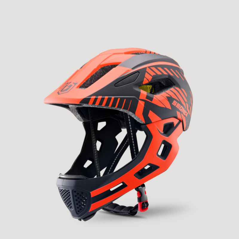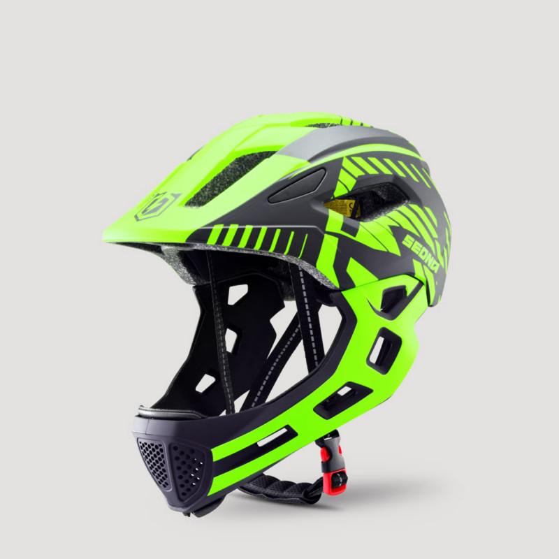 Sa coque robuste en polycarbonate protège efficacement en cas de chute, tandis que la mentonnière démontable assure à la fois une sécurité renforcée et une facilité d’entretien au quotidien.